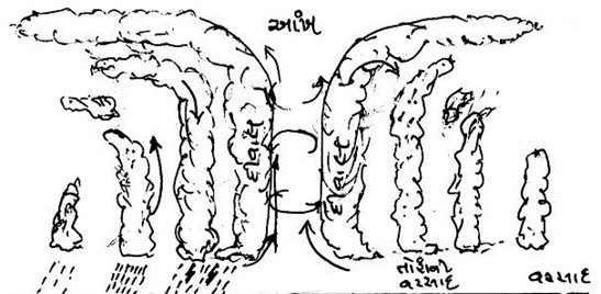 સાથેનાં ચિત્ર (આ. ૪)માં એક વાવાઝોડાંનો ઊભો છેદ (એટલે કે આંતરિક ઘટના) બતાવ્યો છે. તેના કેન્દ્રમાં કંઈ નથી. ત્યાં ઊભા હો તો માથે ભૂરું આકાશ દેખાય. આ વાવાઝોડાંની આંખ છે, તેનો પાંચ થી પચાસ કિ.મી.નો વ્યાસ હોઈ શકે. તે પછી મુખ્ય દિવાલ છે અને તેની બહાર વાદળાંના તૂટક તૂટક નળાકારો છે. આ બધું ફરે છે અને ‘ક્યુમુલો નિમ્બસ’ પ્રકારનાં વાદળાં નીચેનાં સ્થળોએ વરસાદ વરસાવતાં રહે છે.