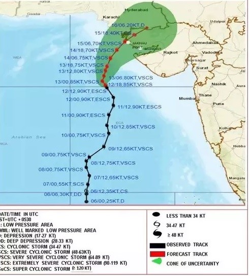 પરંતુ એક વાર એ મુંબઈની ઉત્તરે ગયું ને ગુજરાત ની આસપાસ ના સમુદ્ર નું ઉષ્ણતામાન થોડું ઓછું હોવા થી તેને મળતી ઊર્જા ઘટતી ગઈ. એટલે ૧૨ મી જુન ની ભવિષ્યવાણી તેને જમણી તરફ વાળી જખૌ તરફ જતું બતાવે છે.