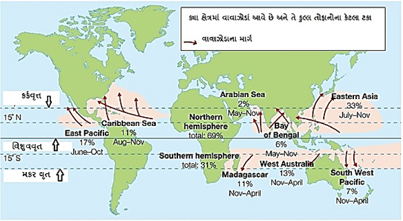 જેમ ચોમાસું દુનિયામાં અમુક સ્થળોએ જ છે, તે રીતે વાવાઝોડાં પણ અમુક ચોક્કસ વિસ્તારોમાં જ આવતાં જણાયાં છે. ચિત્ર-૧ માં આ ક્ષેત્રો જોઈ શકાય છે. આપણા ઉપરાંત એ પૂર્વ એશિયાના દેશો (ફિલીપાઈન્સ વગેરે)માં દેખાય છે. ત્યાં એ પ્રશાંત મહાસાગર બાજુથી આવે છે. બીજો વિસ્તાર વેસ્ટ ઈન્ડિઝના ટાપુઓ છે, જ્યાં ક્યારેક તો આટલાંટિક સમુદ્રમાં ઉઠેલું તોફાન ધરતી પાર કરી પ્રશાંત સાગર તરફ જાય છે. દક્ષિણ ગોળાર્ધમાં ન્યૂઝીલેન્ડ અને ઓસ્ટ્રેલિયા સુધી લટાર મારી આવે છે. કુદરતી પ્રક્રિયા એકની એક જ હોવા છતાં વિશ્વના જુદા જુદા પ્રદેશો એને જુદાં નામથી ઓળખે છે. ગુજરાતીમાં આપણે વાવાઝોડું કહીએ છીએ તેનું અહીં અંગ્રેજી નામ Cyclone (સાયક્લૉન) છે. એવું તોફાન વેસ્ટ ઈન્ડિયન ટાપુઓ ઉપર ‘હરિકેન’ કહેવાય અને જાપાનને કાંઠે ટાઈફૂન. આ બધાં વચ્ચે એક સામ્ય છે કે એ બધાં વિષુવવૃત્તની નજીકથી શરૂ થયાં હોય છે. પછી ભલે હજારો કિલોમીટરની યાત્રા કરી દૂરનાં સ્થળે પટકાતાં હોય અને ત્યાં વિનાશ વેરે.