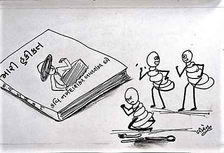 એ મુજબ, આ અંકમાં માત્ર કાર્ટૂન દોરીને મોકલ્યાં હતાં, જ્યારે સંવાદ હાથે લખવાને બદલે મુદ્રિત સ્વરૂપે મૂકાયા હતા. અહીં એ મૂળ કાર્ટૂન અને તેની નીચે સંવાદ મૂકેલાં છે.