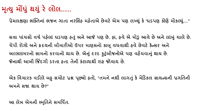જાણીતી નવલકથા “ઝેર તો પીધાં છે જાણી જાણી…’માં નાયિકાના પિતા ગોપાળબાપાની માંદગી અને મૃત્યુનો પ્રસંગ આવે છે. દવા લેવાની એ ના પાડે છે. કહે છે,“ઓષધમૂ જાહન્વી તોયમ્”, ગંગાનું જળ જ હવે ઔષધ છે. સંબંધીઓ એમની પથારીની આસપાસ બેઠા રહે છે, ભજન ગાય છે અને એ વાતાવરણમાં બાપા દેહ છોડે છે.