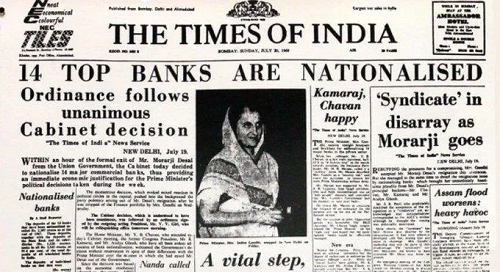 આઝાદી પછી તુરત જ બેંકોના રાષ્ટ્રીયકરણની માંગ ઉઠી હતી. સૌ પહેલા ૧૯૪૮માં તેનો વિચાર થયો હતો. પરંતુ તેનો અમલ કરતાં બે દાયકા થયા. લગભગ છપ્પન વરસ પૂર્વે, ઓગણીસમી જુલાઈ ૧૯૬૯ના દિવસે, ૧૪ બેંકોના રાષ્ટ્રીયકરણનો જે નિર્ણય થયો હતો તે ખૂબ જ નાટકીય હતો. આત્મકથા ‘મારું જીવનવૃત્તાંત’માં મોરારજી દેસાઈ લખે છે: (૧૯મી જુલાઈ ૧૯૬૯ની) બપોરે ત્રણ-ચાર વાગ્યાના સુમારે( નાણાં મંત્રી તરીકેનું) મારું રાજીનામું એમણે સ્વીકારી લીધું છે, એવો પ્રધાન મંત્રીનો ( ઈન્દિરા ગાંધીનો) મને પત્ર મળ્યો. એનો જવાબ પણ મેં એમને લખી મોકલ્યો હતો. એ જ સાંજે એમણે( વડાપ્રધાન શ્રીમતી ગાંધીએ) ચૌદ બેંકોનું રાષ્ટ્રીયકરણ કરવાનો નિર્ણય કરી લીધો હતો અને એની જાહેરાત પણ કરી હતી. (પૃષ્ઠ ૫૨૨)
