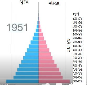 ડાબી તરફ પુરુષોની સંખ્યા અને જમણી તરફ સ્રીઓની સંખ્યા આપી છે. ઉંમરને પાંચ-પાંચ વર્ષનાં જૂથમાં લીધી છે. એના આકારને કારણે એ પિરામિડ કહેવાય છે. વસ્તીવધારાનો દર એટલે જન્મદર અને મૃત્યુના દરનો તફાવત છે. ૧૯૫૧માં આપણો આ દર સૌથી ઓછો, ૧.૩ ટકા, હતો. પછી તે વધતો ગયો. જો દેશમાં જન્મદર વધુ હોય અને બધાં વયજૂથમાં મૃત્યુ થતાં રહે તો આલેખ છે તેવો દેખાય. આપણે ત્યાં, તે પછી જેમ-જેમ આરોગ્ય સુધરતું ગયું અને મૃત્યુનું પ્રમાણ ઘટવા લાગ્યું તેમ આલેખનો આકાર બદલાતો ગયો. વસ્તીવધારાનો દર ૧૯૮૧માં સૌથી વધુ ૨.૨૨ ટકા થઈ ગયો. જોકે છેલ્લાં ત્રીસેક વર્ષથી જન્મનો દર સ્પષ્ટ રીતે ઘટવાથી વસ્તીવધારાનો એકંદર દર ઘટવા લાગ્યો છે. એટલે પિરામિડમાં નીચેના વયગટની સાપેક્ષ સંખ્યા ઘટવા લાગી. ૨૦૨૪ના વર્ષના આલેખમાં ત્રીસ વર્ષની નજીક ગ્રાફ સૌથી પહોળો થઈ તેની ફાંદ નીકળી છે! સમાજમાં પહેલાં સૌથી વધુ સંખ્યા બાળકોની હતી, હવે યુવાનોની છે.
