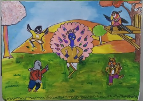 મોરભાઈ મરક મરક હસવા માંડ્યા. – ચાલો જોઇએ બધા પોતાનું ગીત ગાઓ જોઇએ, અને એક સાથે ખિસકોલી, પોપટ અને કક્કુ ગાવા માંડ્યા.