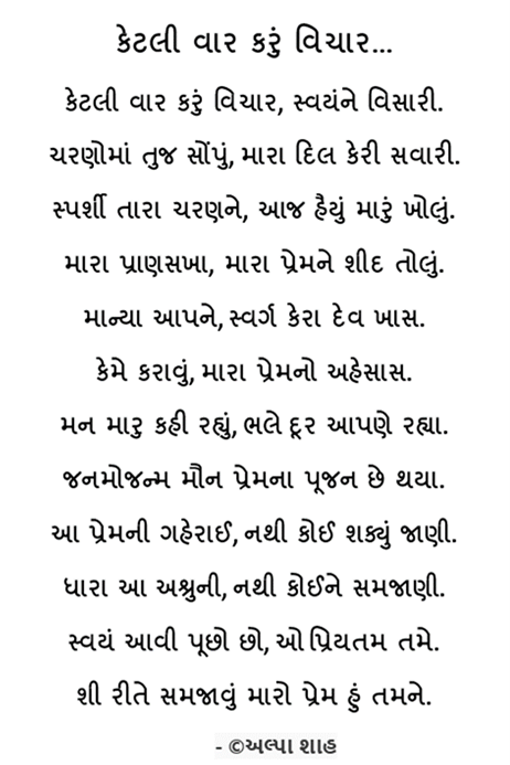 આજના આ ખાસ દિવસે, પ્રેમ પારજોયની એક અતિ પ્રખ્યાત, પ્રચલિત અને સંવેદનશીલ રચનાને આપણે જાણીશું અને માણીશું. આ કવિતામાં ગુરુદેવે જેણે પ્રેમનો પ્રત્યક્ષ એકરાર કર્યો નથી એવા પ્રેમીના મૃદુ મનોભાવોનું ખુબ બારીકાઈથી આલેખન કરેલું છે. 1885માં રચાયેલી આ રચનાનું શીર્ષક છે આ ભાવપૂર્ણ બંગાળી કવિતા નું શીર્ષક છે ” কতবারভেবেছিনু” (Kotobaro Bhebechinu). તેનું ભાવાનુવાદિત શીર્ષક છે “કેટલી વાર કરું વિચાર…”. મેં આ રચનાનો ગુજરાતીમાં પદ્યસ્વરૂપેભાવાનુવાદ કરવાનો નમ્ર પ્રયત્ન કર્યો છે તે દ્વારા આપણે આ રચનામાં રહેલી સંવેદનાઓમાં ભીંજાવાનો પ્રયત્ન કરીશું. કવિવરે આ કાવ્યની રચના એક English song પરથી પ્રભાવિત થયા બાદ કરી હતી.આ કાવ્યમાંકવિવરે મૂળ ગીતનું હાર્દ જળવાઈ રહે તેવી રીતે બંગાળી શબ્દોની શબ્દગૂંથણી કરી છે.