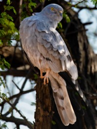 કદમાં નાનું હેરિયર. નરનું શરીર આખું સફેદ હોય છે, માથું ગ્રે અને આંખ ચમકદાર પીળા રંગની હોય છે અને પાંખ પર કાળા પટ્ટા જોવા મળે છે. નર પક્ષી ખૂબ જ દેખાવડા લાગે છે. માદા પક્ષી ભૂખરા રંગ ના હોય છે અને તેમને પાંખ અને પેટના ભાગ પર આડા કાળા પટ્ટા હોય છે! મોનટાગુના હેરિયર એક્રેડિવોર (acridivore) હોય છે, એટલે કે ફક્ત તીડ અને તિત્તીધોડાઓનો જ શિકાર કરી ખાય છે! આ કારણથી તેની હાજરીથી ઘાસિયા મેદાનોમાં તીડની સંખ્યા પર કાબૂ રહે છે.