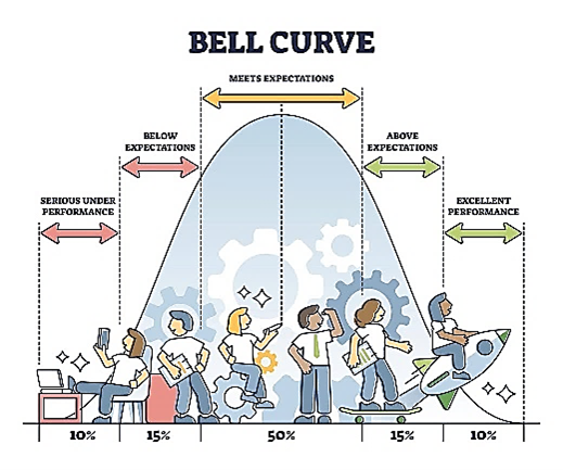 કોઈ પણ પ્રમાણ્ય વિતરણ આલેખ (normal distribution curve)માં ૧૦ % ઉત્તમ, ૧૫% ‘સરેરાશથી સારાં’. ૫૦% (ઠીક ઠીક અપેક્ષા મુજબ) હોય છે. તેનાથી નીચે ૧૫ % ‘અપેક્ષાથી ઊણા’ અને છેલ્લા ૧૦% તો ‘સાવ કાઢી નાખવા’ જેવાં હોય છે.
