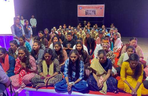 કાર્યક્રમ શરૂ થતાં પહેલાં, પરદા પાછળ, ભાગ લનેાર વિદ્યાર્થિનીઓ
