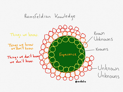 આ રેખાકૃતિને આગળ વધારીને હજુ સુધી જે અજાણ તે અજાણ જ રહેવા વિશે રમ્સફેલ્ડના પ્રખ્યાત અવતરણને લાગુ કરી શકાય. જેટલો વધુ અનુભવ, તેટલી વધુ બાબતોને જાણીએ છીએ તેમ સમજાય છે. તે સાથે એ પણ સમજાય છે કે હજુ એવી ઘણી બાબતો છે આપણે જાણતા નથી. અને શૂં જાણીએ છીએ અને શું નથી જાણતાં એ ભલે ગમે તેટલી મોટી સંખ્યામાં હોય પણ જે અજ્ઞાત બાબતો હજી પણ અજાણ છે તે સંખ્યા તેનાથી અનેક ગણી વધારે (કદાચ અનંત) જ રહેશે.