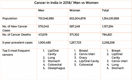 તાજેતરમાં વિજ્ઞાન સંશોધનસામયિક લાન્સેટમાં પ્રગટ અધ્યયન જણાવે છે કે કેન્સર થવાનો ખતરો પુરુષોમાં વધુ હોય છે પરંતુ કેન્સરને કારણે મહિલાઓ વધુ મરે છે. ભારત માટે તો આ અધ્યયન એવી ચિંતાજનક બાબત નોંધે છે કે ભારતીય મહિલાઓના કેન્સરને કારણે થતાં મોતમાં ૩૭ ટકા મોત સમયસર નિદાન અને સારવારના અભાવે થાય છે. ૬૭ ટકા મહિલાઓને જો સમયસર કેન્સરની તપાસ અને ઈલાજ મળ્યાં હોત તો તેમનો રોગ આગળ વધતો અટકાવી શકાયો હોત.