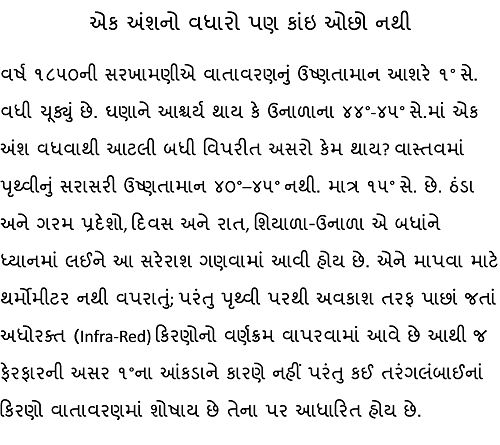 કઠણાઈ એ વાતની છે કે એ અશ્વત્થામા જેવો અમર છે – હજારો વર્ષ ઝળૂંબતો રહેવાનો છે! અને વર્ષાનુવર્ષ સિલક વધતી જાય છે. અને જેમ-જેમ ગ્રીન હાઉસ વાયુઓનો સંઘરો વધતો જાય છે, તેમ-તેમ વાતાવરણમાં ઉષ્મા પણ સંઘરાતી જાય છે. પરિણામે ઉષ્ણતામાન વધતું જાય છે. ઈ.સ. ૧૮૫૦ની સરખામણીએ તે અત્યારે ૦.૮થી ૧૦ સે. જેટલું વધી ચૂક્યું છે. માત્ર આટલો વધારો કેટલો પરચો બતાવે છે તેનાં આપણે જ સાક્ષી છીએ. તો, આવું ક્યાં સુધી ચાલી શકે?
