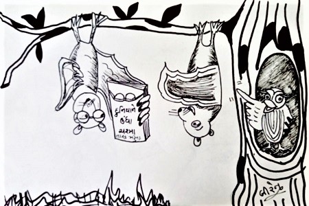 (ડાબેથી) ચામાચીડિયું ૧: “આ ચોપડી છતી પકડવાની કે ઉંધી?”