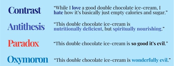ઑક્સિમૉરન /વિરોધાભાસ (અલંકાર) : ઑક્સિમૉરન એ એક એવો અલંકાર છે જેનો અર્થ સ્વ-વિરોધાભાસી હોઈ શકે છે (દુશ્મનનો દુશ્મન એ મિત્ર છે). બીજા શબ્દોમાં કહીએ તો ઑક્સિમૉરન વિરોધી અર્થ ધરાવતા શબ્દો (જીવતું હાડપિંજર) નું સંયોજન છે.