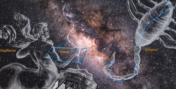 સાભાર: https://galacticcenter.astro.ucla.edu/learn-about-our-galaxy.html)પૃથ્વીને છોડી થોડી વાર માટે આકાશમાં દૃષ્ટિ માંડીએ. પૃથ્વીના સંદર્ભે આપણી દૂધ ગંગા આકાશગંગાનું કેન્દ્ર લગભગ ૨૬,૦૦૦ પ્રકાશ વર્ષ દૂર સ્થિત સેગીટેરિયસ એ* નામના કૃષ્ણ વિવર (બ્લેક હૉલ)માં છે. એ કૃષ્ણ વિવર પાશ્ચાત્ય રાશિચક્ર પ્રમાણે ધનુ રાશિ અને વૃશ્ચિક રાશિ વચ્ચે સ્થિત છે જે આકૃતિ ૧માં રક્તિમ વર્તુળમાં જોઈ શકશો. એમાં ૨૪ અંશ ઘટાડતા ભારતીય જ્યોતિષ પ્રમાણે તુલા અને વૃશ્ચિક રાશિ વચ્ચેનું સ્થાન આવે છે. કેન્દ્રનો વિસ્તાર લાખો તારાઓનો બનેલો છે જેના કેન્દ્રમાં કૃષ્ણ વિવર છે. આ વિસ્તારની ઘનતા સમજવા પૃથ્વીનું દૃષ્ટાંત લઈએ. પૃથ્વી માટે સૂર્ય પછી સહુથી સમીપ તારો જય (આલ્ફા સેન્ટોરી) ૪.૩ પ્રકાશ વર્ષ જેટલા અંતરે છે. આકાશ ગંગાના કેન્દ્રે આટલા અંતરમાં લગભગ દશ લાખ તારા છે! અને, કેન્દ્રમાં સ્થિત કૃષ્ણ વિવરનું દળ ચાલીસ લાખ સૂર્ય જેટલું છે. આવા કદાવર વિવરના અવિરત ચાલતા યજ્ઞમાં જે પદાર્થ હોમાય છે એનાથી અનેકગણો પ્રકાશ ઉત્પન્ન થાય છે. સાથે અનેક પ્રકારના વિદ્યુત ચુંબકીય તરંગો અને ગુરુત્વાકર્ષણના તરંગો ઉત્પન્ન થાય છે.