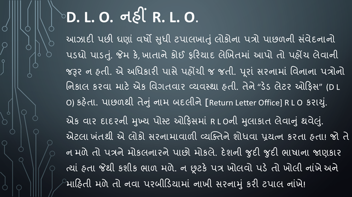 આમ છતાં, કોઈ પત્ર ગેરવલ્લે જાય તો તેની ભાળ કાઢવાનીય વ્યવસ્થા હતી. જેને “ડેડ લેટર ઓફિસ’ કહેતા.